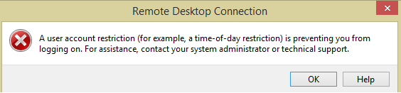 A user account restriction (for example,a time-of-a-day restriction) is preventing you from logging on. For assistance, contact your system administrator or technical support.
