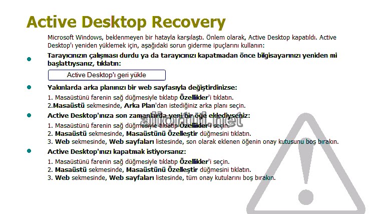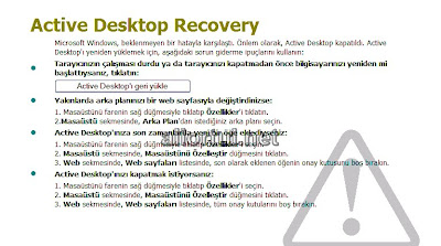 Microsoft Windows, beklenmeyen bir hatayla karşılaştı.Önlem olarak Active Desktop kapatıldı. Active Desktop’ı yeniden yüklemek için, aşağıdaki sorun giderme ipuçlarını kullanın: