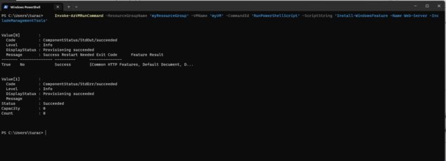 Invoke-AzVMRunCommand -ResourceGroupName 'myResourceGroup' -VMName 'myVM' -CommandId 'RunPowerShellScript' -ScriptString 'Install-WindowsFeature -Name Web-Server -IncludeManagementTools' |