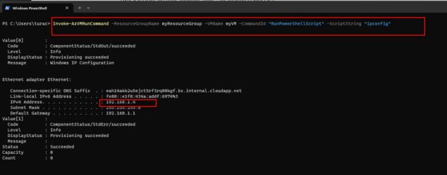 Invoke-AzVMRunCommand -ResourceGroupName 'myResourceGroup' -VMName 'myVM' -CommandId 'RunPowerShellScript' -ScriptString 'ipconfig' |