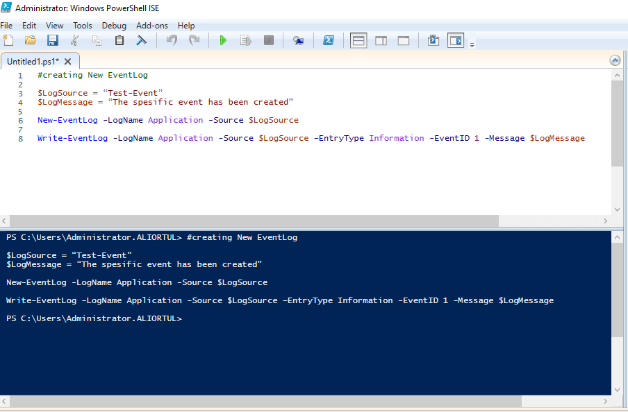 #creating New EventLog $LogSource = “Test-Event” $LogMessage = “The spesific event has been created" New-EventLog -LogName Application -Source $LogSource Write-EventLog -LogName Application -Source $LogSource –EntryType Information -EventID 1 -Message $LogMessage |