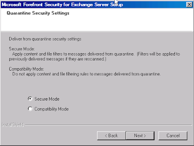 Gelen ekranda Forefront için güvenli modumu, uyumluluk modunumu kullanmak istediğimizi soruyor. Default da gelen Secure mode karantina altına alınmış mailleri tara Compatibility mode ise karantinaya alınan mailleri taramaz. Biz Secure Mode seçerek ilerliyoruz