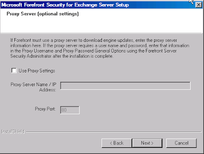 Eğer bir proxy server kullanıyorsak forefrontun updateleri çekebilmesi için proxy değerlerini giriyoruz ve Next ile devam ediyoruz