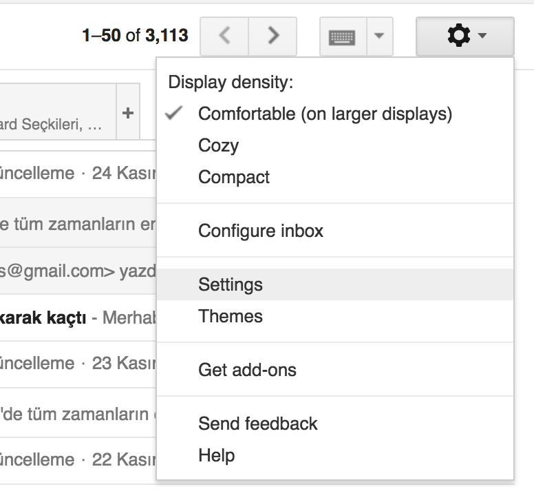 Klasörümüzü yarattıktan sonra gmail ayarlarına gelerek filtrelemeyi oluşturmakta sıra. Bunu yapmak için Gmail penceresi üzerinde sağ tarafta bulunan çark simgesini tıklıyoruz ve Settings (Ayarlar) diyoruz.