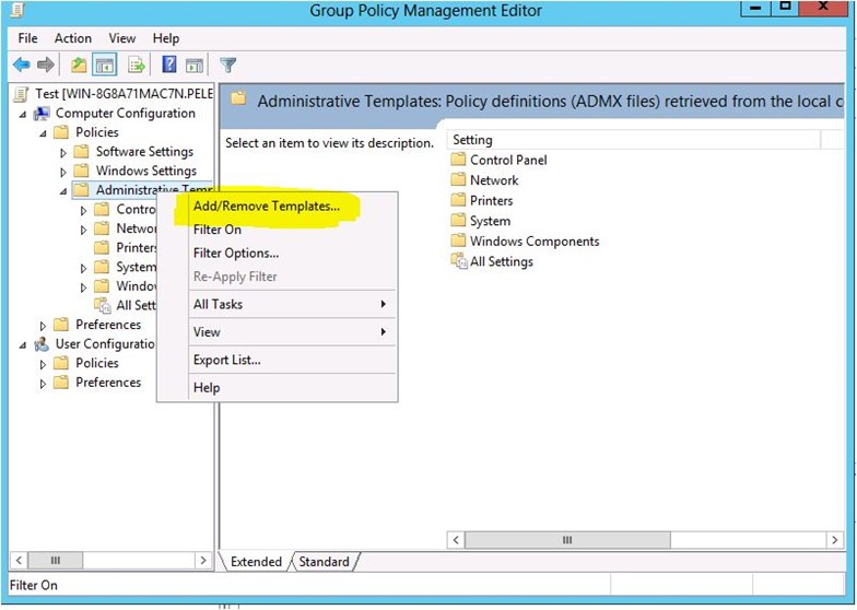 Bundan sonra, Yönetim Şablonu’na gidin ve üzerine sağ tıklayın ve ” Add/Remove Templates ” seçin.