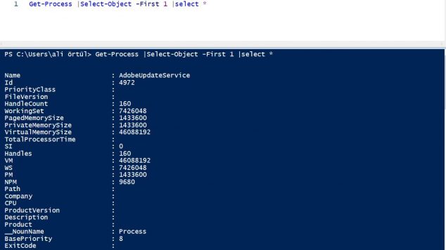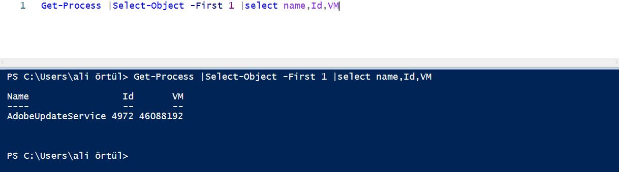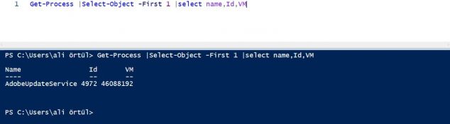 İlk olarak aşağıdaki komutla get-process kullanacağım ve processleri çekeceğim fakat select object ile çıktıları süzerek yanlızca ilk sonucu ekrana yazdıracağım.