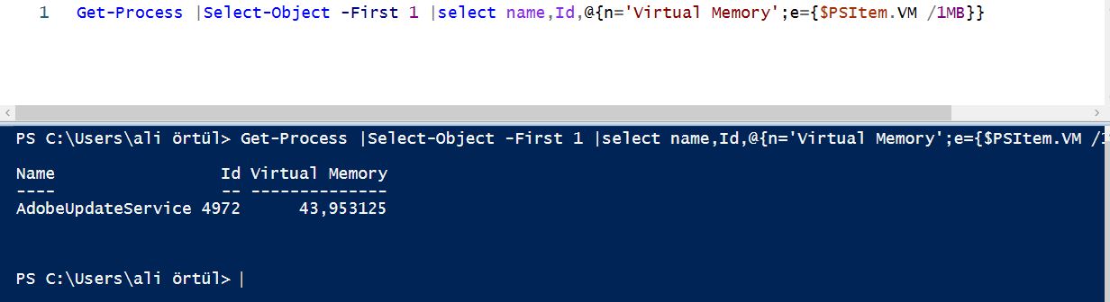 Get-Process |Select-Object -First 1 |select name,Id,@{n=’Virtual Memory’;e={$PSItem.VM /1MB}}
