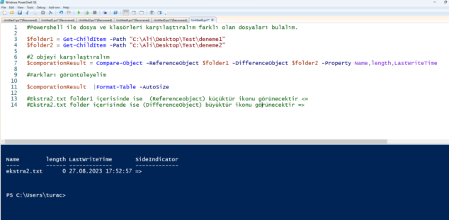 #Powershell ile dosya ve klasörleri karşılaştıralım farklı olan dosyaları bulalım. $folder1 = Get-ChildItem -Path "C:\Ali\Desktop\Test\deneme1" $folder2 = Get-ChildItem -Path "C:\Ali\Desktop\Test\deneme2" #2 objeyi karşılaştıralım $comporationResult = Compare-Object -ReferenceObject $folder1 -DifferenceObject $folder2 -Property Name,length,LastWriteTime #Farkları görüntüleyelim $comporationResult |Format-Table -AutoSize #Ekstra2.txt folder1 içerisinde ise (Referenceobject) küçüktür ikonu görünecektir <= #Ekstra2.txt folder içerisinde ise (DifferenceObject) büyüktür ikonu görünecektir => |