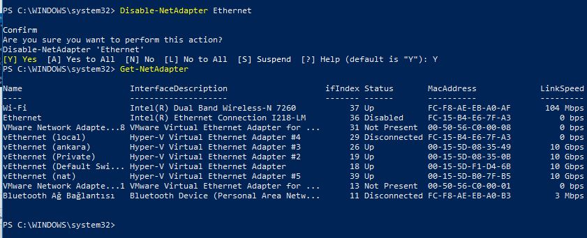 Disable-NetAdapter Ethernet,vethernet (ankara)