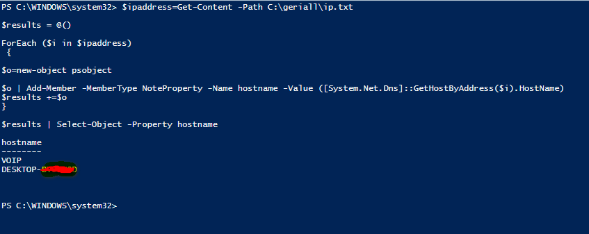 $ipaddress=Get-Content -Path C:\ip.txt $results = @() ForEach ($i in $ipaddress) { $o=new-object psobject $o | Add-Member -MemberType NoteProperty -Name hostname -Value ([System.Net.Dns]::GetHostByAddress($i).HostName) $results +=$o } $results | Select-Object -Property hostname | Export-Csv C:\ip.txt |