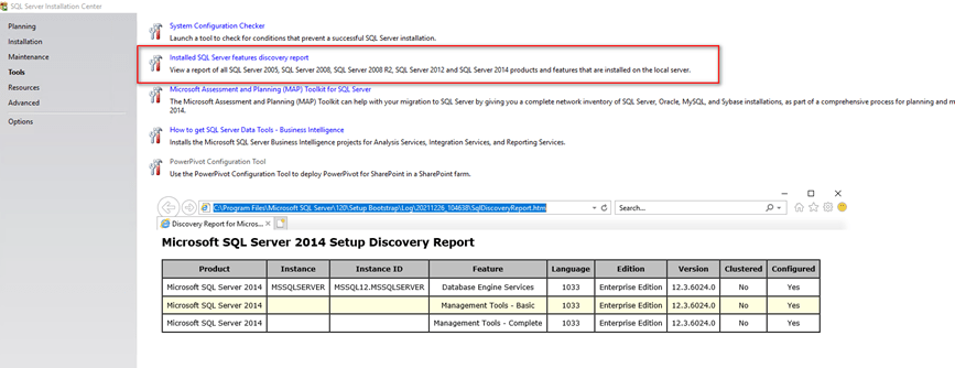 - Sql Server Reporting Services’in kurulu olup olmadığını anlamak için Sql Server Installation Center’dan Tools ve Installed SQL Server Features Discovery report’u check ediyorum. Ve Reporting Service’nin kurulu olmadığını görüyorum.