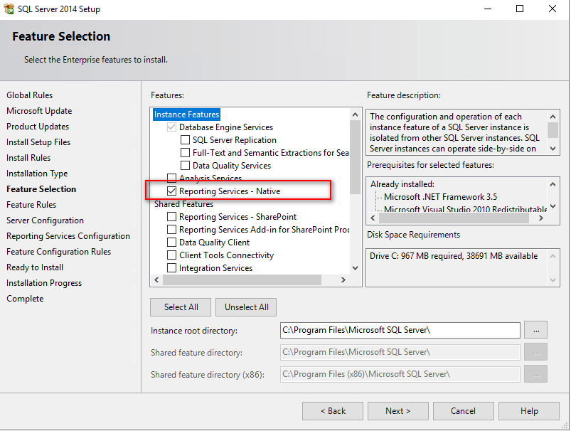 Gelen ekranda kurulmasını istediğim features olan Reporting Services seçiyorum ve ilerliyorum.