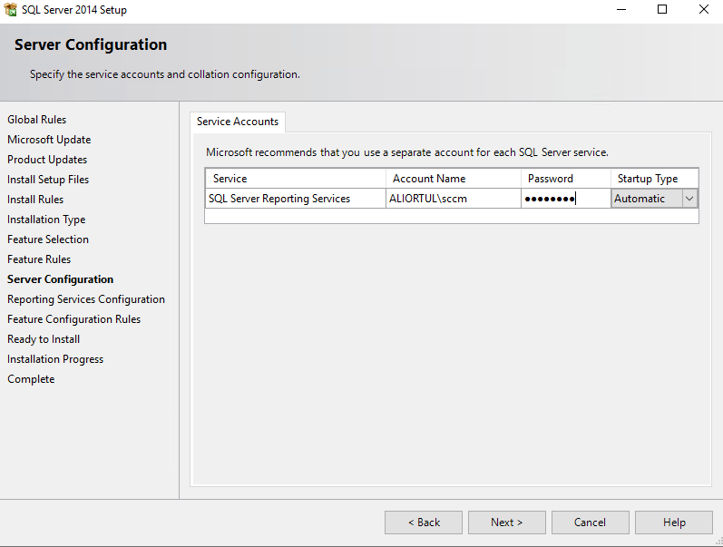 Ben reporting Service SCCM için kullandığımdan sccm servis hesabımı seçiyorum ve startup Type automatic olacak şekilde ayarlıyorum. Siz default bırakabilir veya SSRS için create ettiğiniz bir user varsa onunla da kullabilirsiniz.