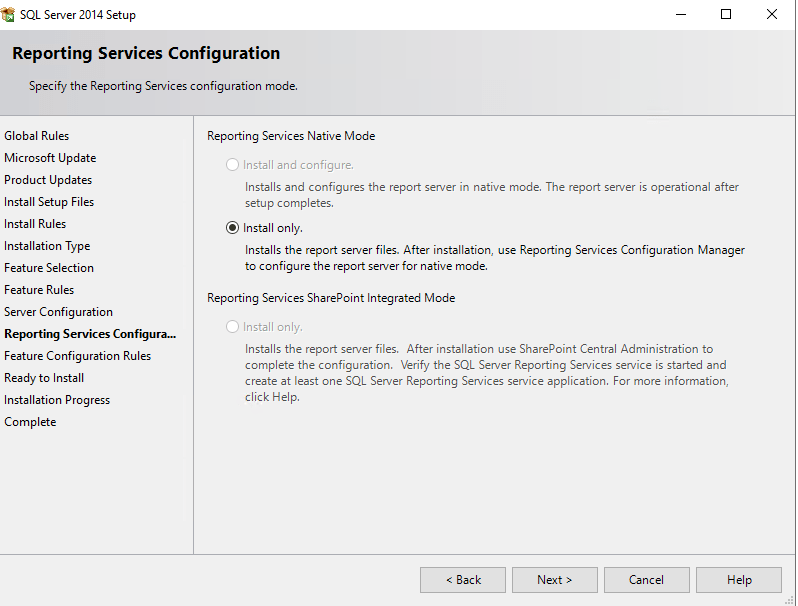 Report server Install only tek seçenek olarak devam ediyorum. Reporting Services features kurulumunda sharepoint seçseydiniz diğer seçeneği de aktif görecektiniz.