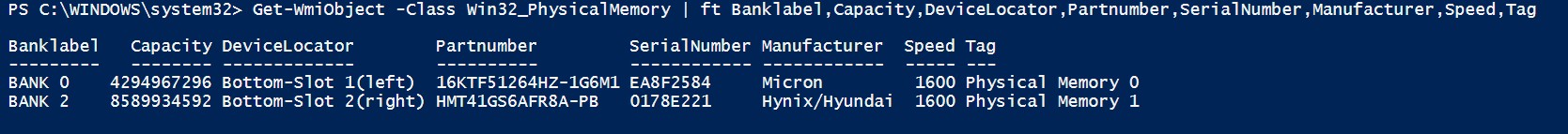 Get-WmiObject -Class Win32_PhysicalMemory | ft Banklabel,Capacity,DeviceLocator,Partnumber,SerialNumber,Manufacturer,Speed,Tag |