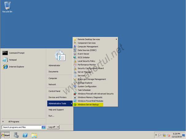 Windows Server Backup aracı, Başlat menüsünde Administrative Tools altında yer alır.