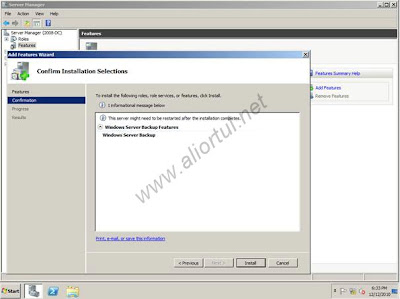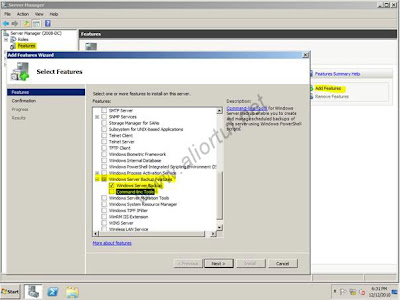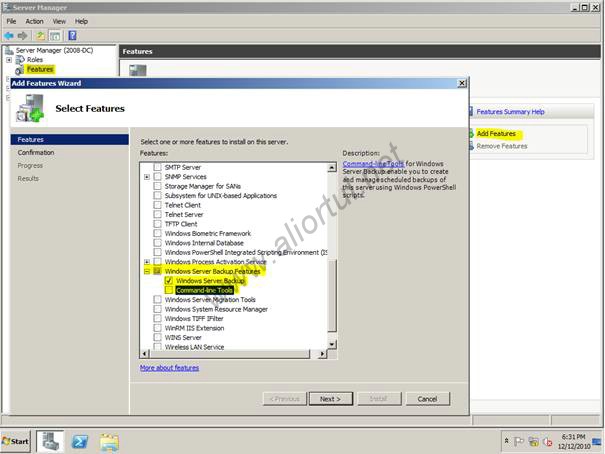 Bu aracı sisteme yüklemek için Server Manager açılmalı ve burada yer alan Features bileşeninde yer alan “ Add Features” seçilmelidir. Yüklene bilecek ek özellikler listesinden “ Windows Server Backup” özelliği seçilir.