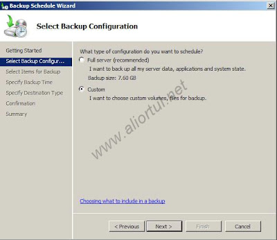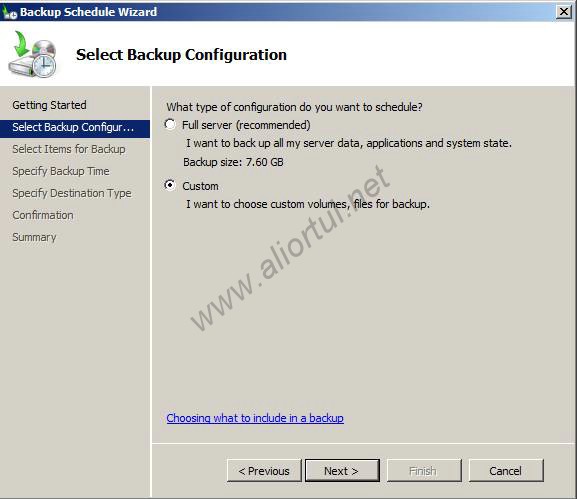 Yedekleme konfigürasyonunun seçilmesini isteyen pencere karşımıza geldiğinde full server yada custom seçeneklerini kullanarak istenilen verilen yedeklenmesini sağlayabiliyoruz.
