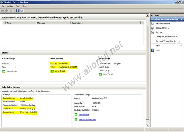 Windows Server Backup ekranına geri döndüğümüzde zamanlama yapmış olduğumuz yedekleme işlemini bu pencerede tüm ayarları ile görebiliyoruz. View Details linki ilede tüm detaylarını görebiliriz.