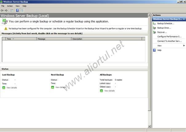 Öncelikle Windows Server Backup ekranında sağ üst köşede bulunan Backup Schedule sihirbazını çalıştırıyoruz.