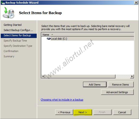 Seçimi tamamladıktan sonra ok butonunu kullanarak select items for backup penceresine geri dönüyor ve next ile devam ediyoruz.