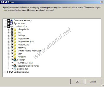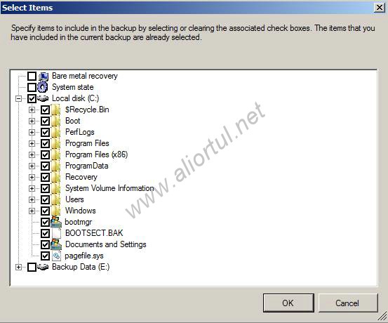Select items for backup penceresinde add items butonunu kullanrak istediğimiz diskin yada istediğimiz klasörlerin seçilebileceği liste karşımıza geliyor. Ve listeden istenilen verileri seçiyoruz. Ben direkt olarak C diskinin yedeklerini almak üzere seçimi yaptım.