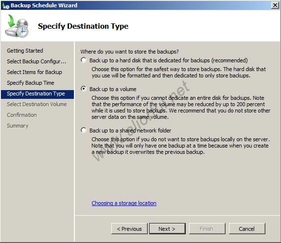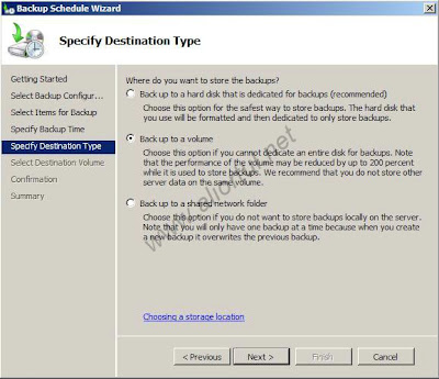 1-      Back up to a hard disk that is dedicated for backups (recommended) :  yedekleme işlemi için sunucu üzerine takılmış teyp yedekleme ünitesi veya harici bir usb veya Firewire üzerine takılmış bir disk için bu seçeneği seçiyoruz. Ayrıca bu seçenek yine seçili iken next ile devam ederek sunucu üzerinden bulunan local disk üzerine de yine yedekleme işlemi yapılabiliyor. Bu seçenek bakupları saklamak için en iyi yoldur. Ancak bu seçenkle yapacağınız yedekleme işleminde disk formatlanır. Yani bu bölümde kesinlikle veri tutmamanız gerekmektedir.