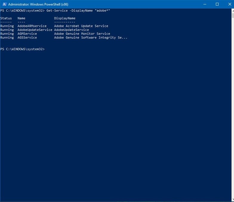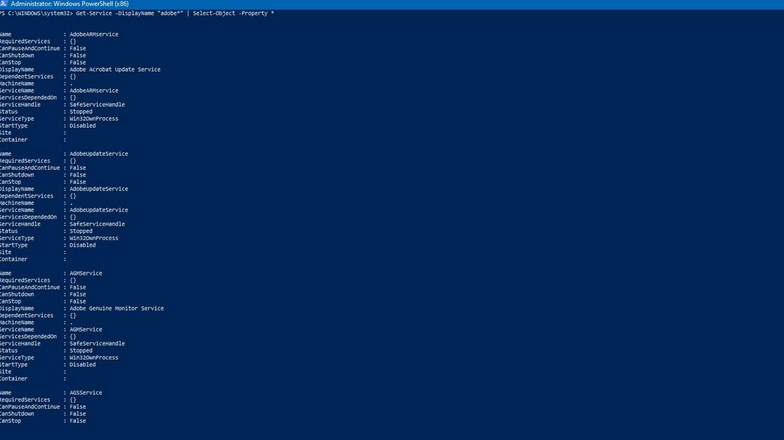 Get-Service -DisplayName “adobe*” | Select-Object -Property *