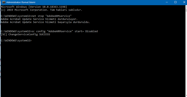 Sonrasında AdobeARMservice servisin açılışta disable duruma gelmesini sağlıyorum